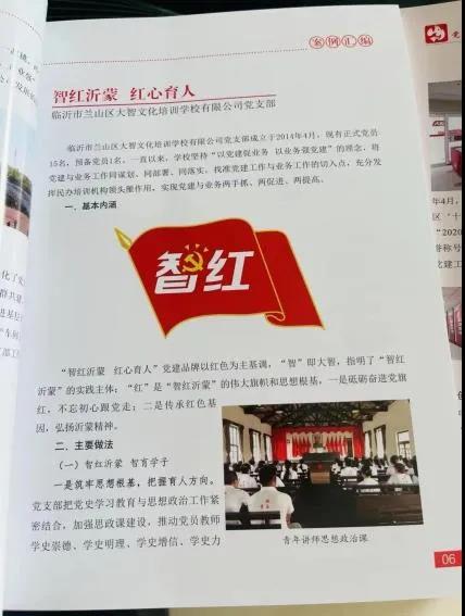 大智臨沂區(qū)域成立于2011年,在蘭山區(qū)委組織部、蘭山區(qū)教育和體育局及集團(tuán)黨委的大力支持和領(lǐng)導(dǎo)下,于2014年4月成立黨支部,后又相繼成立了團(tuán)總支、婦女委員會(huì)、工會(huì)等群團(tuán)組織,經(jīng)過實(shí)踐探索,大智臨沂區(qū)域打造了”智紅沂蒙三個(gè)三“工作法、“智紅沂蒙 紅心育人”黨建工作品牌,真正做到服務(wù)社會(huì),服務(wù)企業(yè),服務(wù)黨員。在黨建工作中不斷創(chuàng)新并與其他黨支部進(jìn)行了黨建共建。