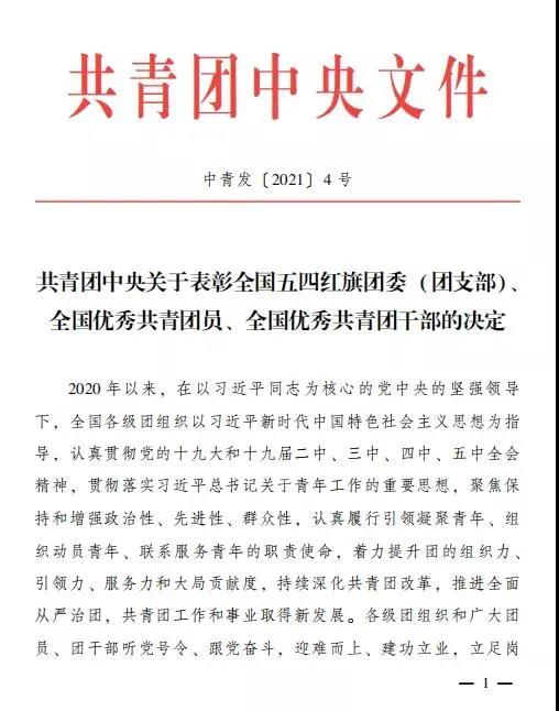 4月27日,共青團(tuán)中央發(fā)布《關(guān)于表彰全國(guó)五四紅旗團(tuán)委(團(tuán)支部)、全國(guó)優(yōu)秀共青團(tuán)員、全國(guó)優(yōu)秀共青團(tuán)干部的決定》,山東省濟(jì)寧市任城