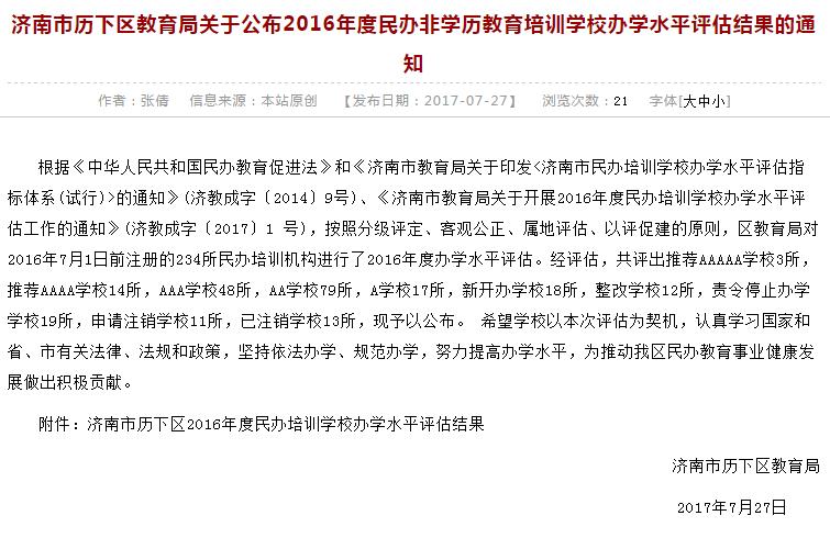 10月29日,從濟南市教育局傳來喜訊,濟南市歷下區(qū)大智培訓(xùn)學(xué)校在2016年度民辦培訓(xùn)學(xué)校辦學(xué)水平評估中,被評為 “AAAAA學(xué)校”,根據(jù)《濟...