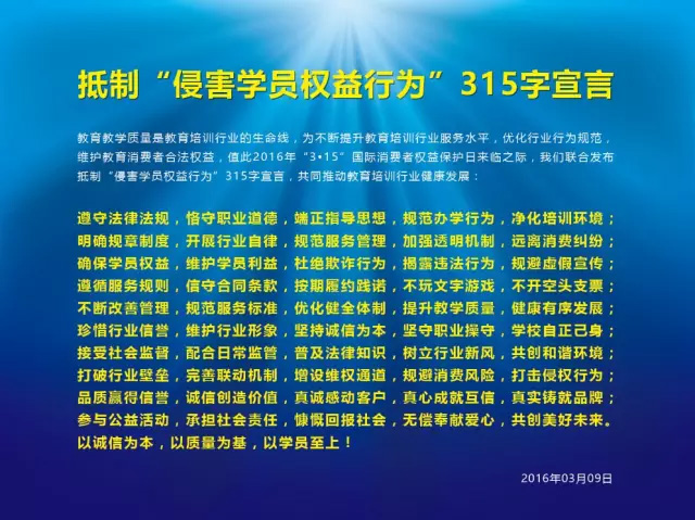 研討會上,教育培訓(xùn)機構(gòu)共同發(fā)起了抵制“侵害學(xué)員權(quán)益行為”315字宣言: