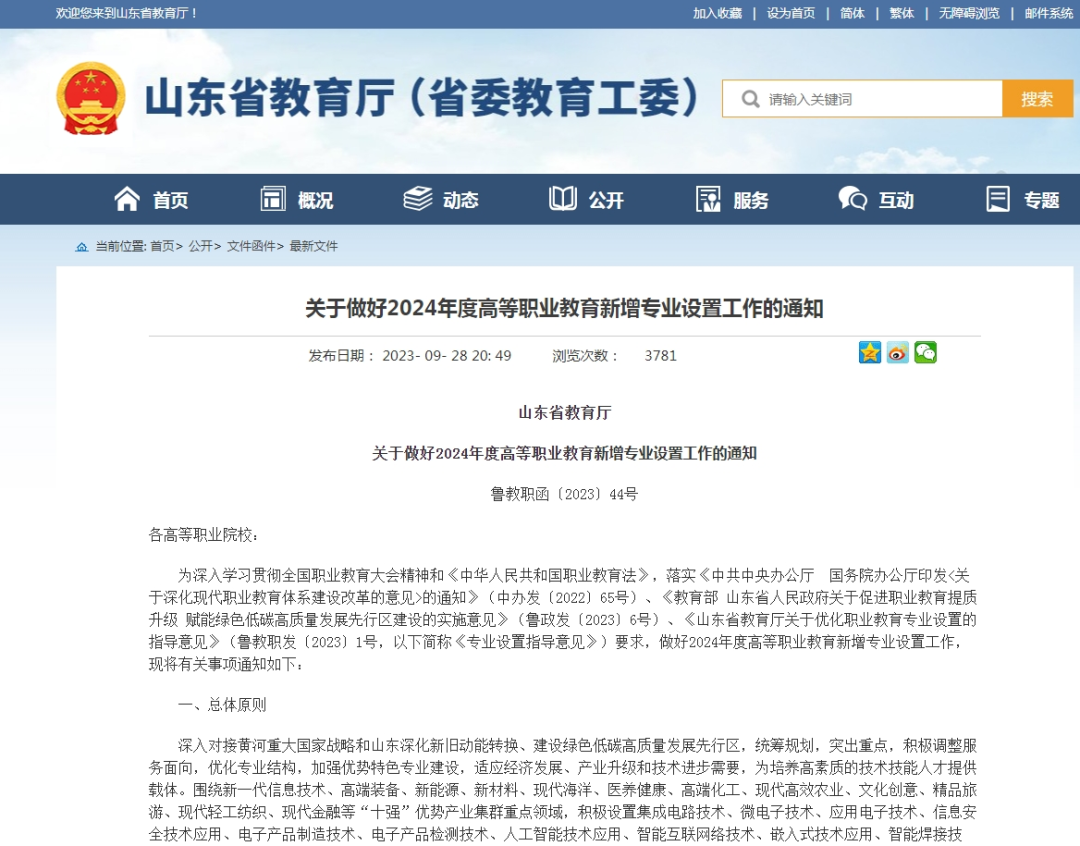 近日,山東省教育廳印發(fā)《關(guān)于做好2024年度高等職業(yè)教育新增專業(yè)設(shè)置工作的通知》。