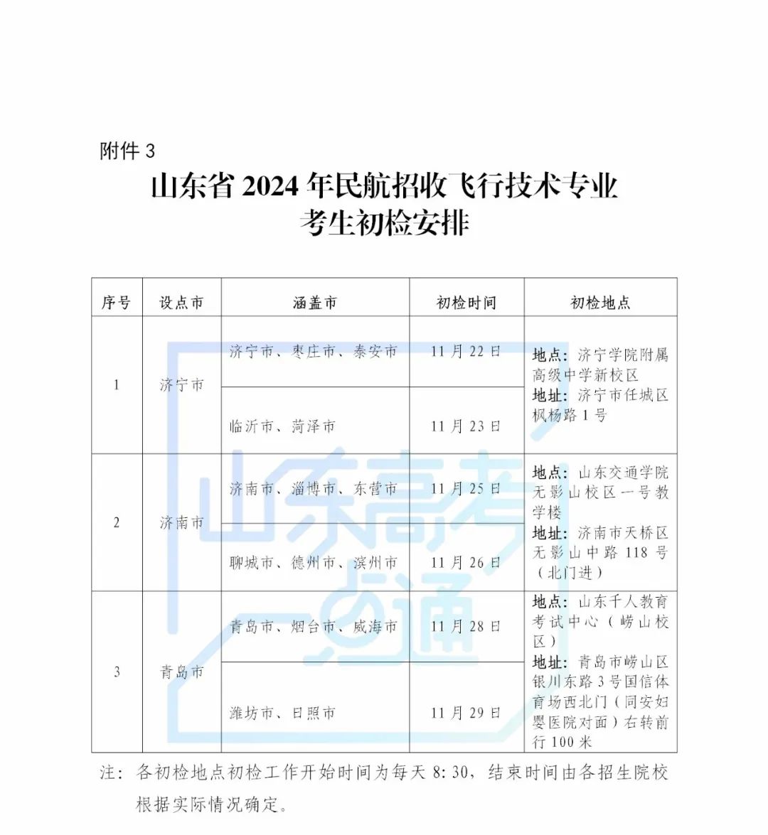 (二)初檢預(yù)選。招飛各項(xiàng)選拔工作由各院校具體組織實(shí)施。我省在濟(jì)南、青島、濟(jì)寧3市設(shè)立招飛初檢站,各招生院校按照規(guī)定時(shí)間在每個(gè)初檢站分別組織初檢預(yù)選工作,具體時(shí)間地點(diǎn)安排見附件3??忌殧y帶身份證及報(bào)考院校規(guī)定的證件材料等,按照附件3規(guī)定的時(shí)間地點(diǎn)到達(dá)指定初檢站,參加擬報(bào)考院校組織的民航飛行技術(shù)專業(yè)的初檢預(yù)選。