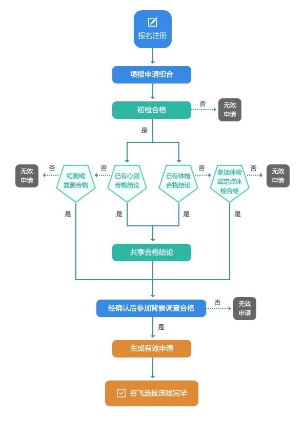 為幫助您在招飛選拔過程中節(jié)約時(shí)間和費(fèi)用,便于您更好地備考,同時(shí)讓您有機(jī)會(huì)在更多的合格申請(qǐng)組合中選擇確認(rèn)有效招飛申請(qǐng),系統(tǒng)對(duì)部分環(huán)節(jié)的結(jié)論在特定情況下設(shè)定了結(jié)論共享。請(qǐng)注意,這里的結(jié)論共享特指申請(qǐng)組合之間共享。