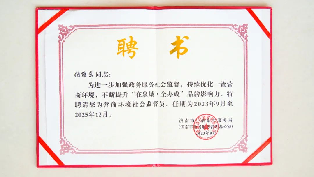 為進(jìn)一步加強(qiáng)政務(wù)服務(wù)、社會(huì)監(jiān)督,持續(xù)優(yōu)化一流營(yíng)商環(huán)境,不斷提升“在泉城?全辦成”品牌影響力。近日,濟(jì)南市行政審批服務(wù)局特聘大智控股集團(tuán)創(chuàng)始人、董事長(zhǎng)張維東擔(dān)任營(yíng)商環(huán)境社會(huì)監(jiān)督員,任期兩年。