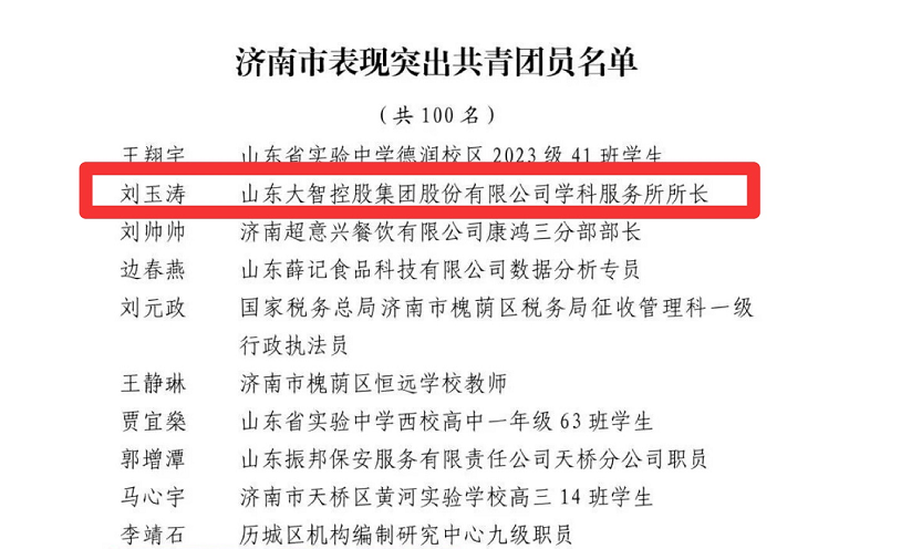 近日,共青團(tuán)濟(jì)南市委發(fā)布《共青團(tuán)濟(jì)南市委關(guān)于表?yè)P(yáng)在2024年度濟(jì)南市共青團(tuán)工作中表現(xiàn)突出集體和個(gè)人的通報(bào)》,大智控股集團(tuán)學(xué)科服務(wù)所所長(zhǎng)劉玉濤...
