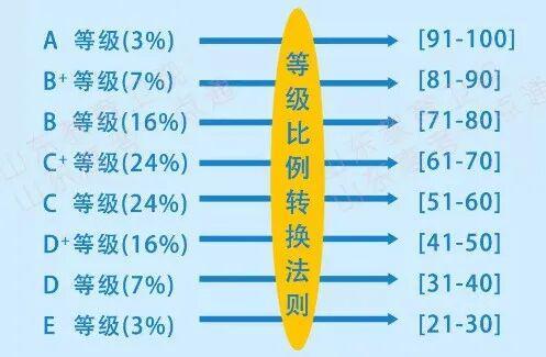 參照正態(tài)分布原則,確定各等級(jí)區(qū)間人數(shù)所占比例對(duì)應(yīng)著: A等級(jí)占3%、B+等級(jí)占7%、B等級(jí)占16%、C+等級(jí)占24%、C等級(jí)占24%、D+等級(jí)占16%、D等級(jí)占7%、E等級(jí)占3%。