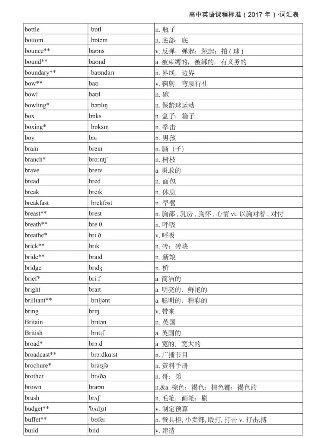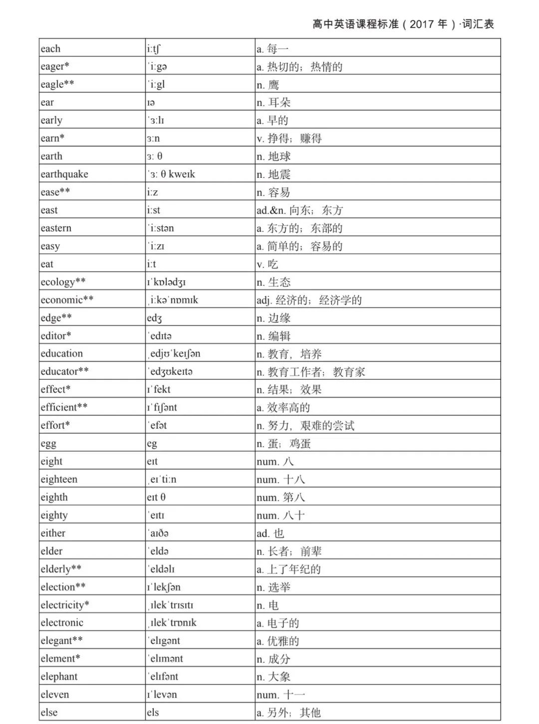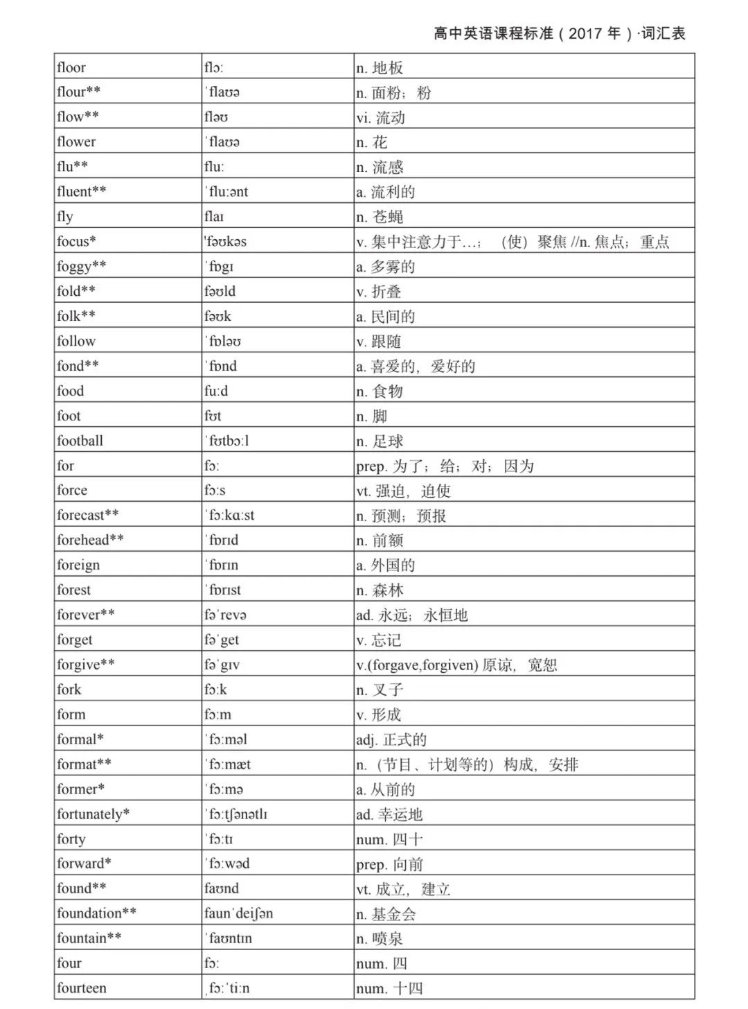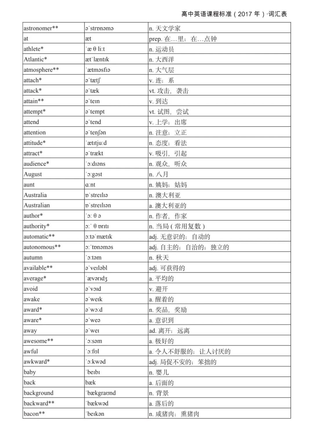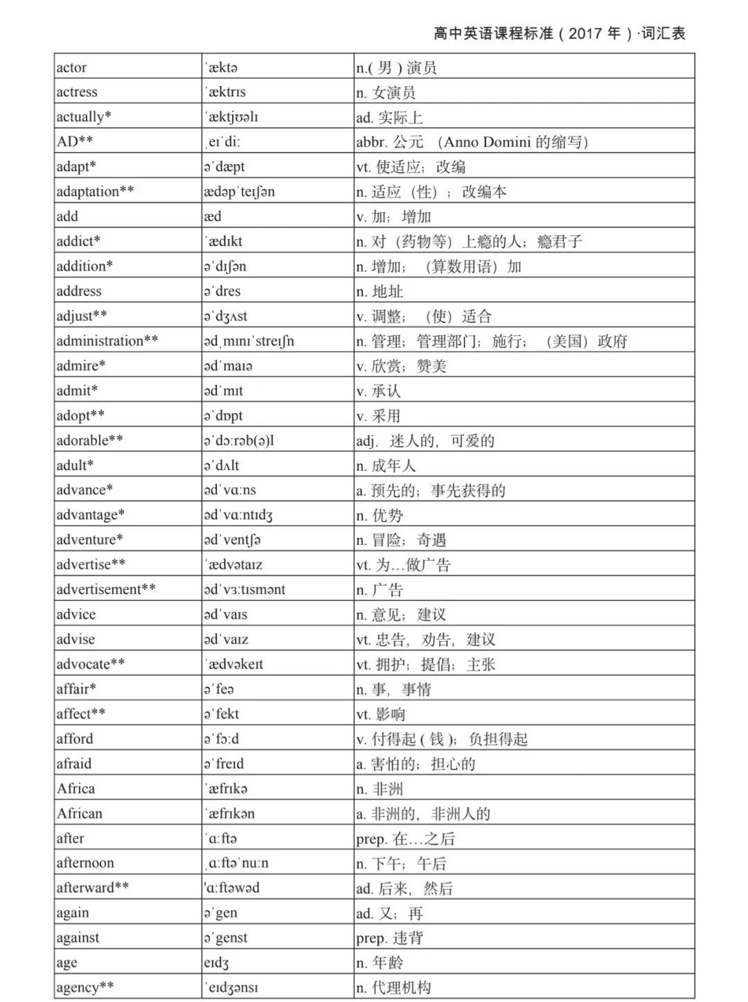 本詞匯表共收 3000 個(gè)單詞,含義務(wù)教育階段要求掌握的 1500 個(gè)單詞。高中英語必修課程應(yīng)學(xué)習(xí)和掌握 500 個(gè)單詞(表中加有一個(gè) * 號(hào)),累計(jì)達(dá) 2000。選擇性必修課程應(yīng)學(xué)習(xí)和掌握 1000 個(gè)單詞(表中加有兩個(gè) *號(hào)),累計(jì)達(dá) 3000。各地可根據(jù)實(shí)際情況在本詞匯表所收詞的基礎(chǔ)上,再選擇增加 200 個(gè)單詞。