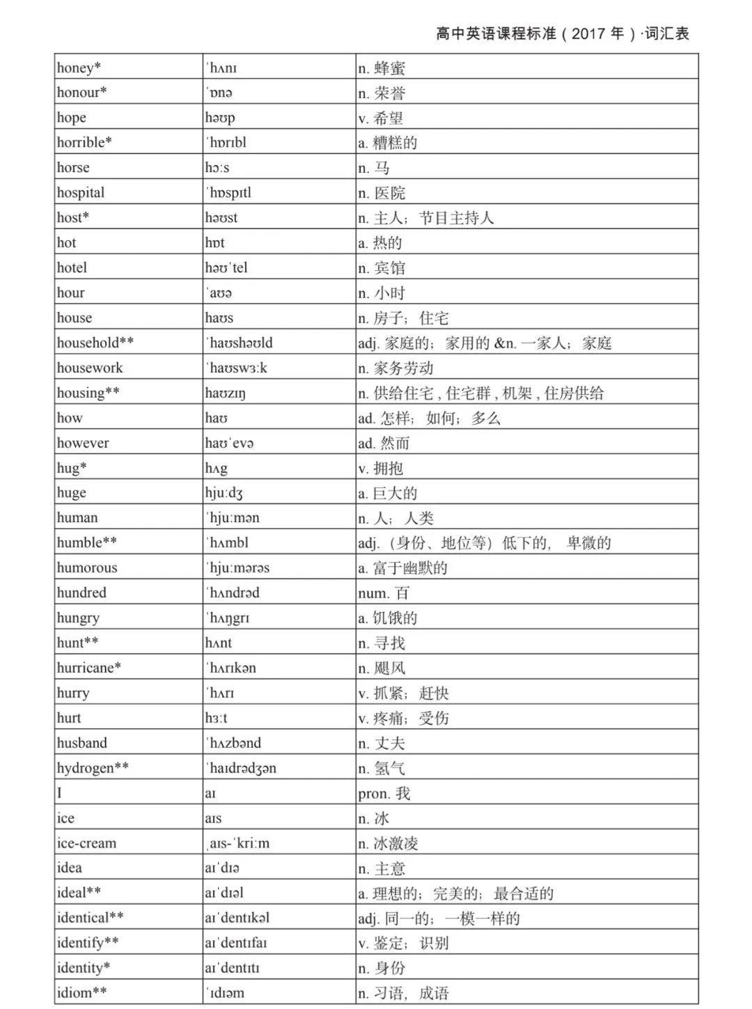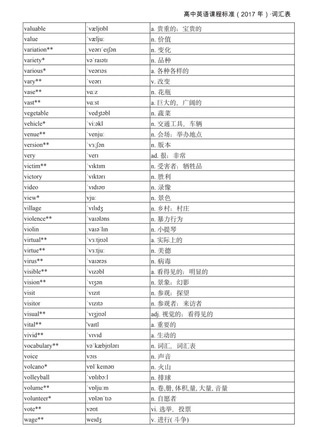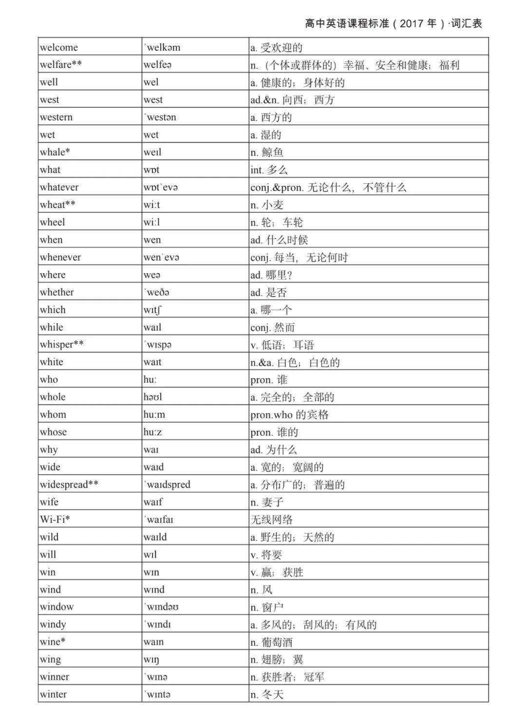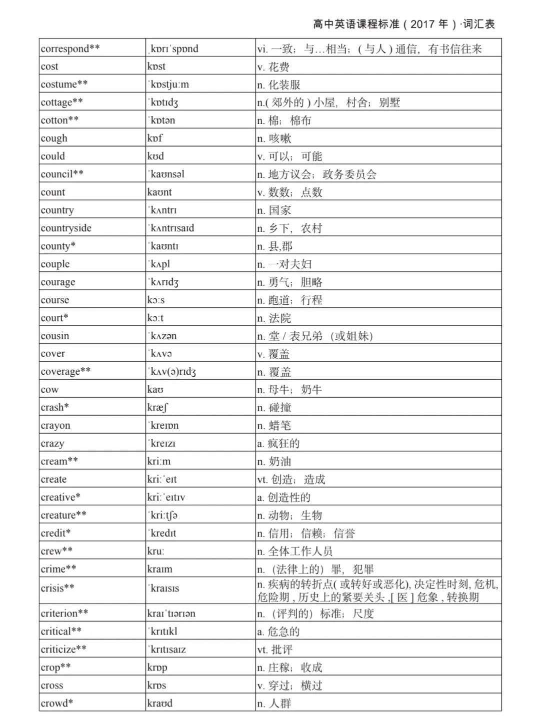 本詞匯表共收 3000 個(gè)單詞,含義務(wù)教育階段要求掌握的 1500 個(gè)單詞。高中英語必修課程應(yīng)學(xué)習(xí)和掌握 500 個(gè)單詞(表中加有一個(gè) * 號(hào)),累計(jì)達(dá) 2000。選擇性必修課程應(yīng)學(xué)習(xí)和掌握 1000 個(gè)單詞(表中加有兩個(gè) *號(hào)),累計(jì)達(dá) 3000。各地可根據(jù)實(shí)際情況在本詞匯表所收詞的基礎(chǔ)上,再選擇增加 200 個(gè)單詞。