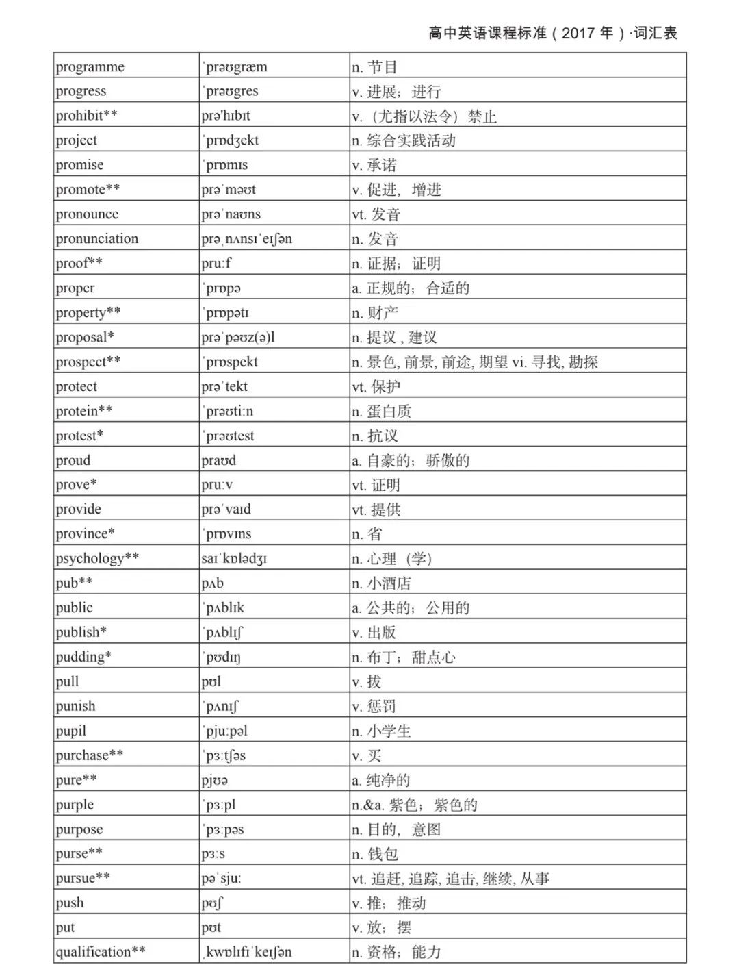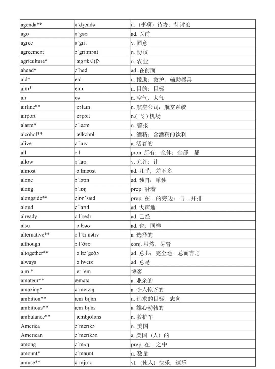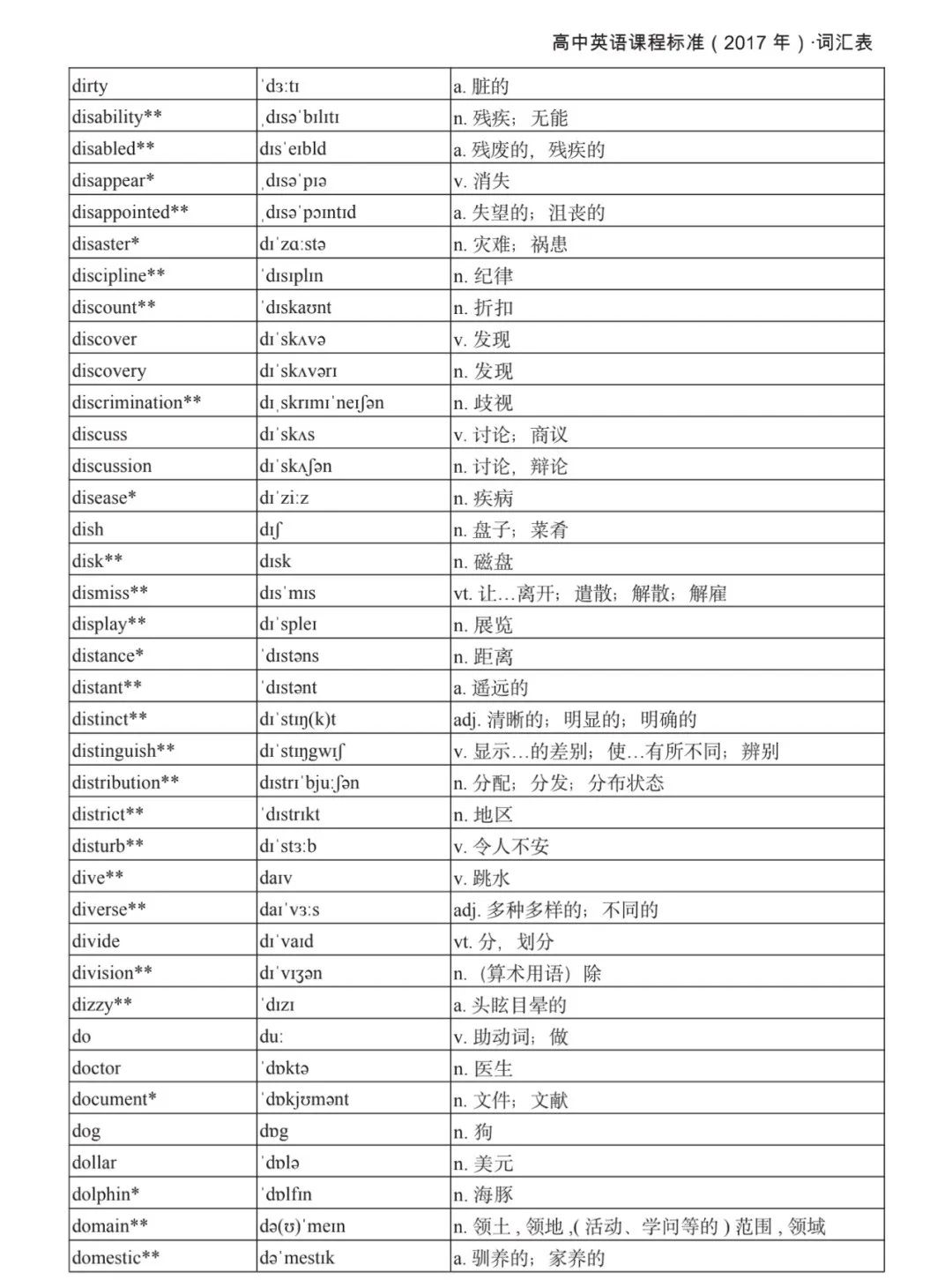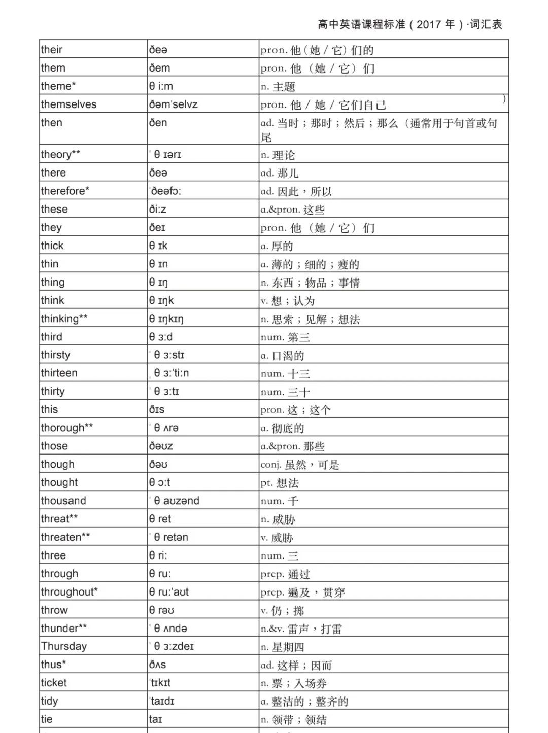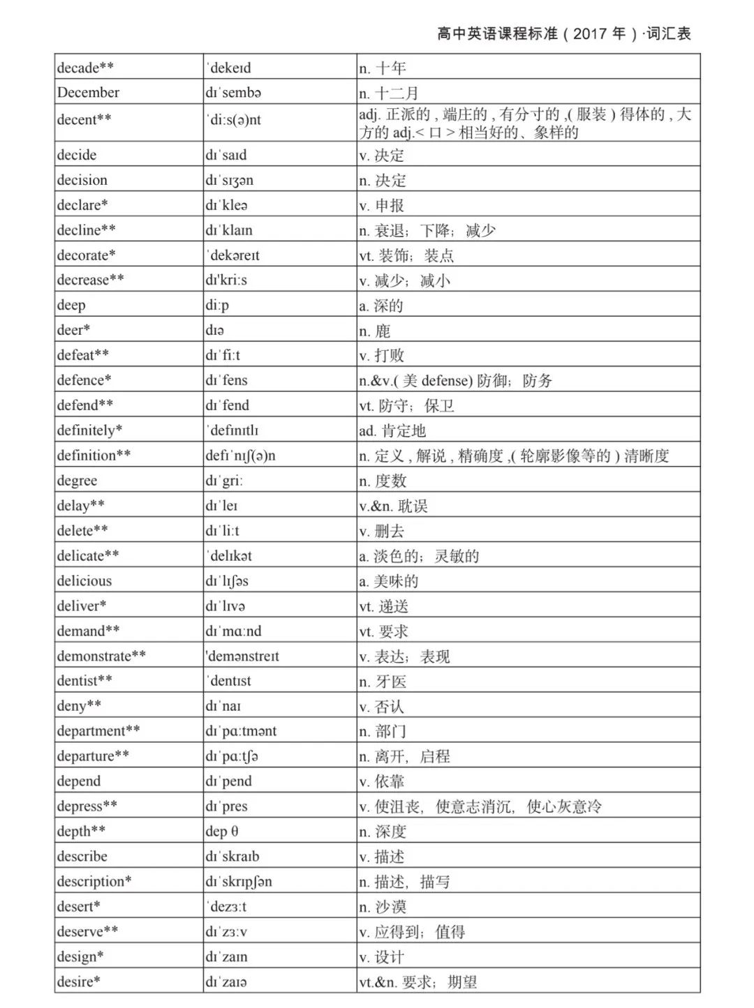 本詞匯表共收 3000 個(gè)單詞,含義務(wù)教育階段要求掌握的 1500 個(gè)單詞。高中英語必修課程應(yīng)學(xué)習(xí)和掌握 500 個(gè)單詞(表中加有一個(gè) * 號(hào)),累計(jì)達(dá) 2000。選擇性必修課程應(yīng)學(xué)習(xí)和掌握 1000 個(gè)單詞(表中加有兩個(gè) *號(hào)),累計(jì)達(dá) 3000。各地可根據(jù)實(shí)際情況在本詞匯表所收詞的基礎(chǔ)上,再選擇增加 200 個(gè)單詞。