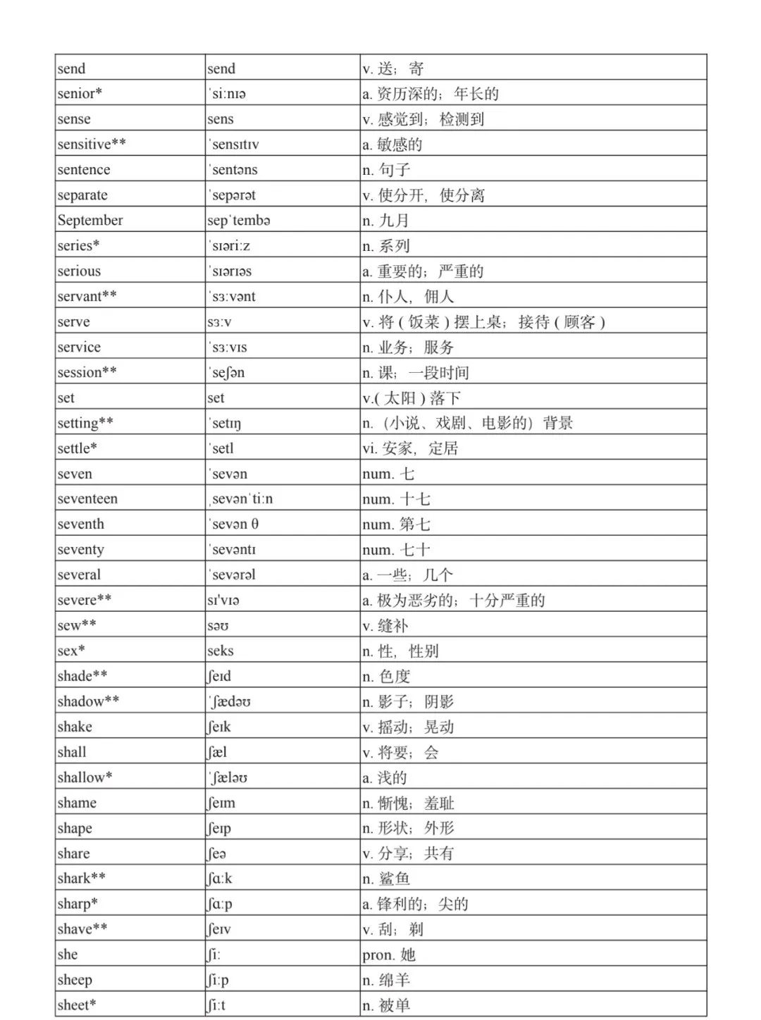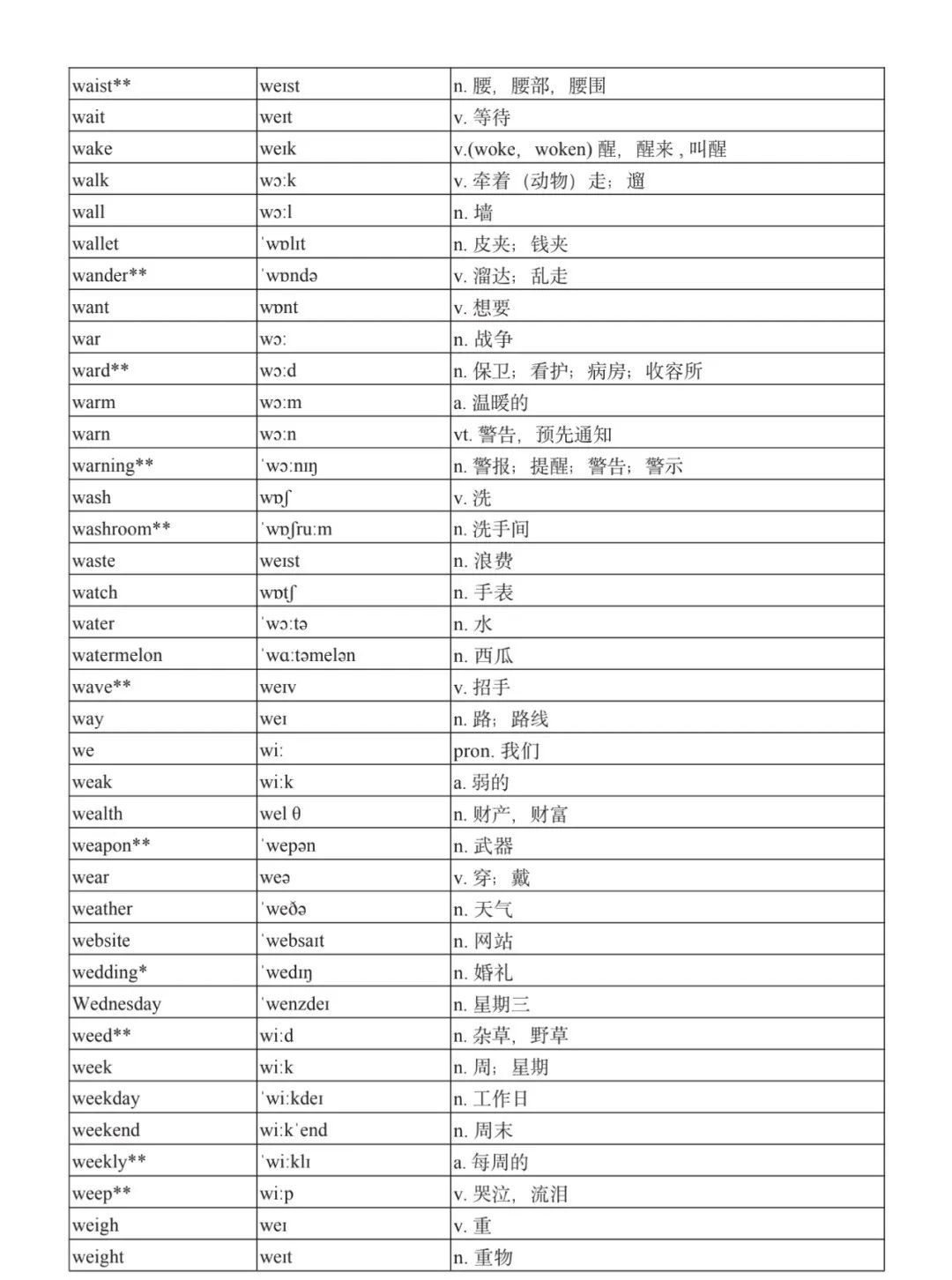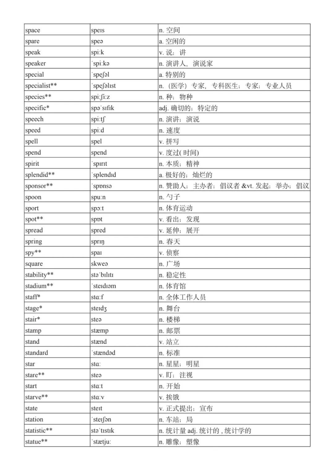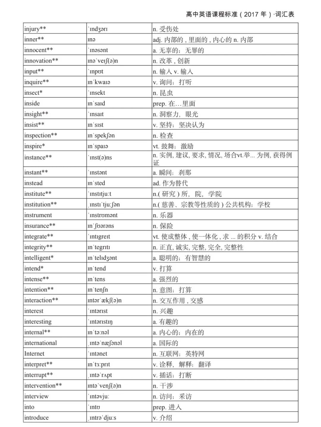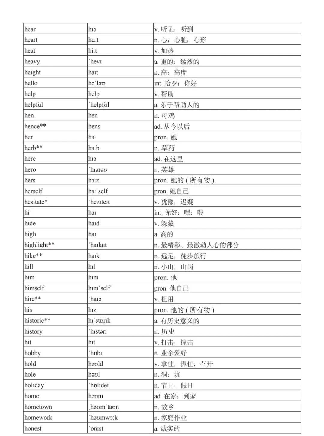 本詞匯表共收 3000 個(gè)單詞,含義務(wù)教育階段要求掌握的 1500 個(gè)單詞。高中英語必修課程應(yīng)學(xué)習(xí)和掌握 500 個(gè)單詞(表中加有一個(gè) * 號(hào)),累計(jì)達(dá) 2000。選擇性必修課程應(yīng)學(xué)習(xí)和掌握 1000 個(gè)單詞(表中加有兩個(gè) *號(hào)),累計(jì)達(dá) 3000。各地可根據(jù)實(shí)際情況在本詞匯表所收詞的基礎(chǔ)上,再選擇增加 200 個(gè)單詞。