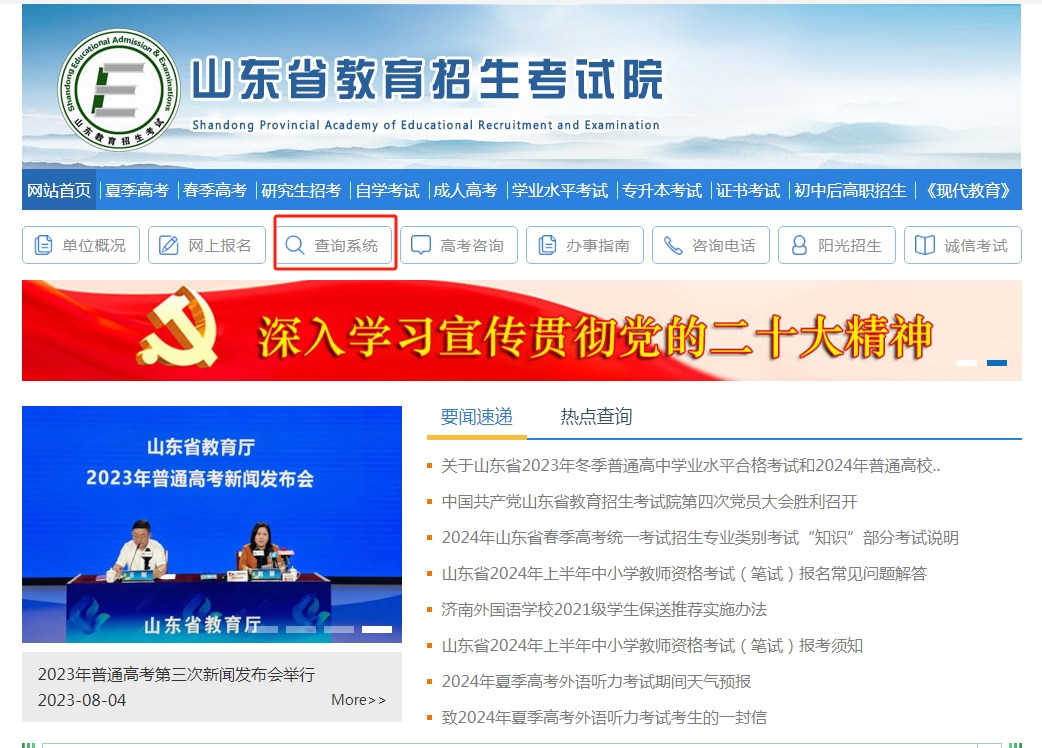登錄山東省教育招生考試院官網(wǎng)(http://www.sdzk.cn/),在【查詢系統(tǒng)】頁(yè)面下查詢。