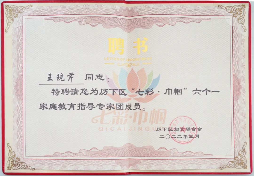王現(xiàn)芹被聘為歷下區(qū)“七彩•巾幗”六個一家庭教育指導(dǎo)專家團成員,她表示,將堅持落實習總書記關(guān)于“注重家庭、注重家教、注重家風”的重要論述,全方位解讀家庭、家教、家風話題和家庭建設(shè)的深刻內(nèi)涵,當好家庭建設(shè)的“指導(dǎo)員”。
