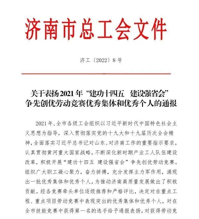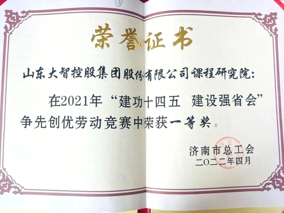 近日,濟南市總工會印發(fā)《關(guān)于表揚2021年“建功十四五  建設(shè)強省會”爭先創(chuàng)優(yōu)勞動競賽優(yōu)秀集體和優(yōu)秀個人的通報》,山東大智控股集團股份有限公司課程研究院榮獲2021年“建功十四五  建設(shè)強省會”爭先創(chuàng)優(yōu)勞動競賽一等獎。