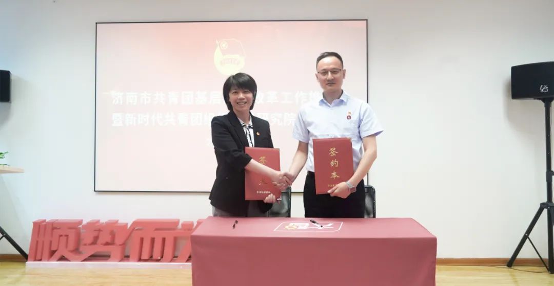 歷下區(qū)團(tuán)委書記羅茜與研究院院長(zhǎng)昌舉岡共同簽訂《合作協(xié)議》。